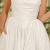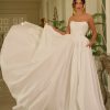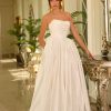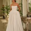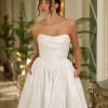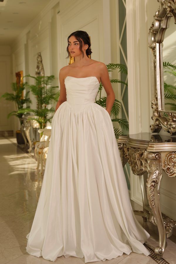 DESCRIPTIONA vision of classic refinement, the Marcelline gown reimagines timeless romance through modern artistry. Crafted in sumptuous wedding satin, its A-Line strapless dress features delicate ruching that sculpts and flatters the form before cascading into a full, sweeping skirt. The soft, draped basque bodice adds texture and elegance, while the full, flowing skirt creates movement and charm with every step. Side Hidden pockets add a touch of ease and functionality, while the fluid drape captures every glimmer of light with quiet luxury. With its graceful movement and architectural simplicity, Perfect for brides who want classic beauty with a hint of contemporary flair.