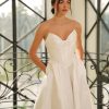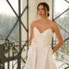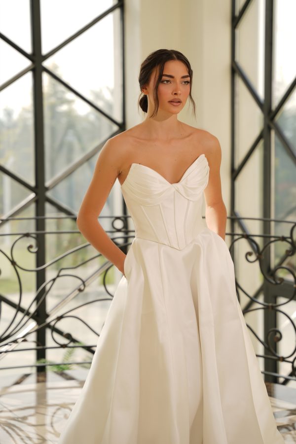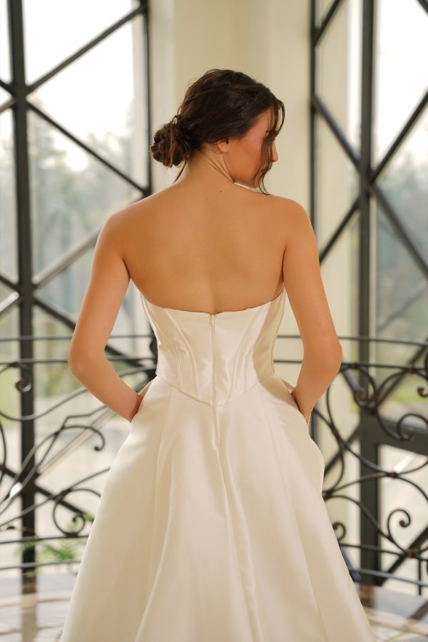 Ethereal in form and flawlessly structured, the Laurenne gown evokes the grandeur of modern couture. Crafted from luminous mikado, it sculpts the torso with a refined, corseted flattering bodice that seamlessly transitions into a voluminous full skirt flows beautifully. The subtle sweetheart neckline enhances feminine grace and romantic while the internal boning defines an hourglass silhouette with impeccable precision. Designed with discreet pockets add a fun, modern touch. A smooth zip-back finish, Laurenne marries architectural tailoring with effortless romance — a statement of purity, poise, and timeless allure with a fresh, stylish twist!