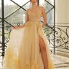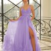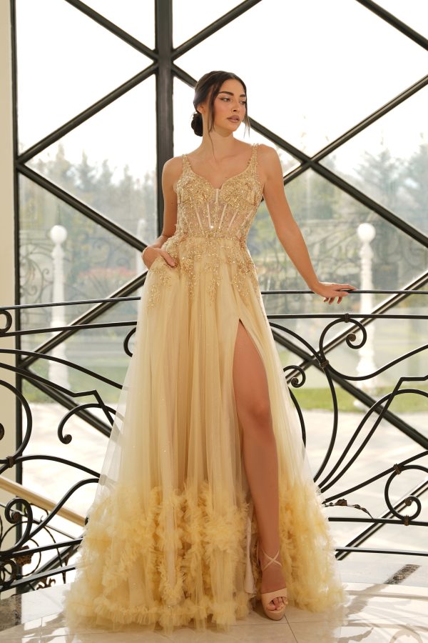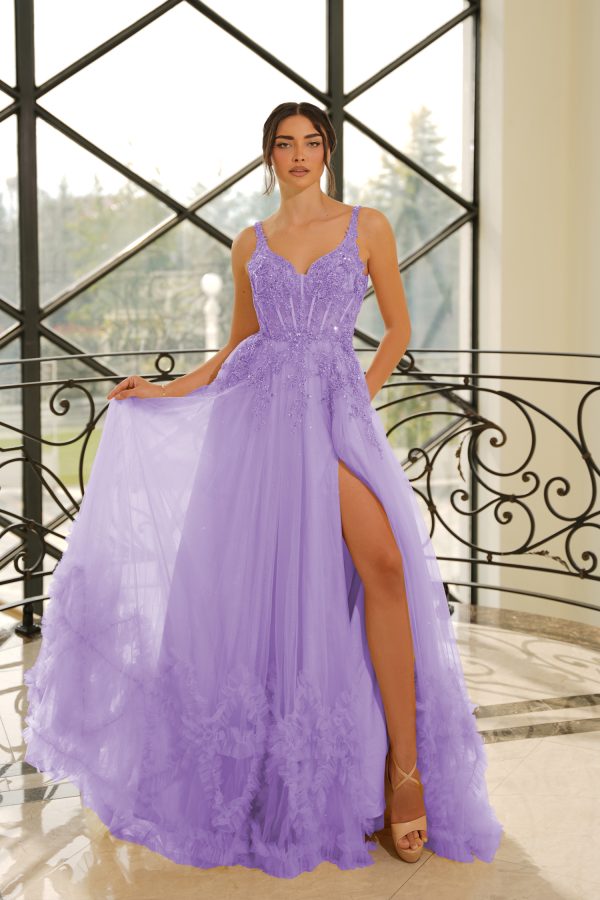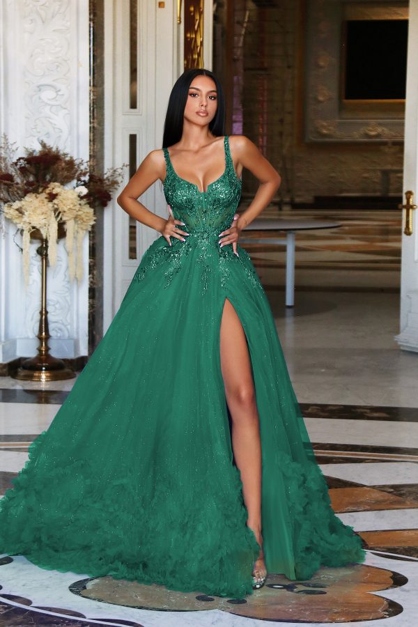 Skirt & Movement: Full, multi-layered tulle skirt flares into dramatic volume. A thigh-high slit reveals a sleek satin lining, while plush tulle ruffles at the hem create stunning texture and whimsical motion.