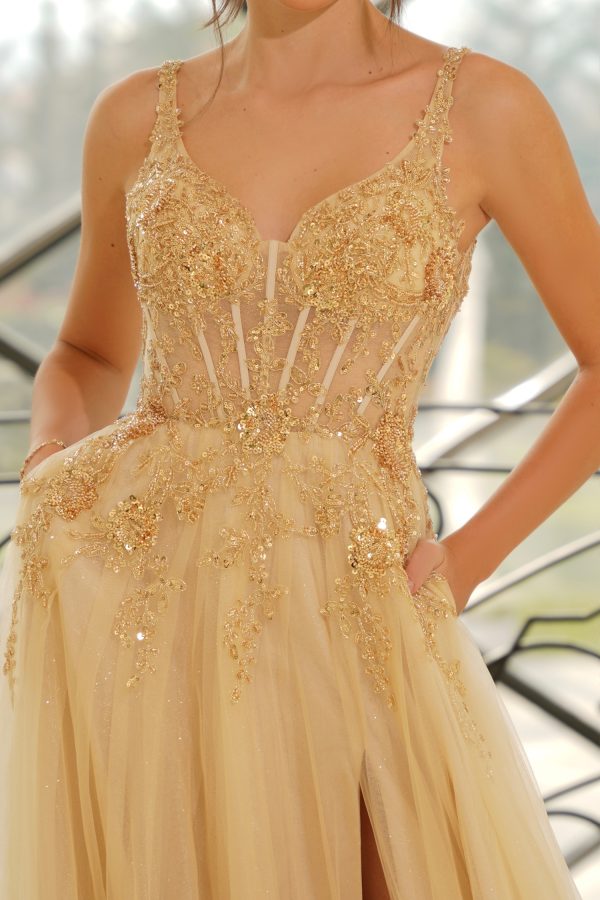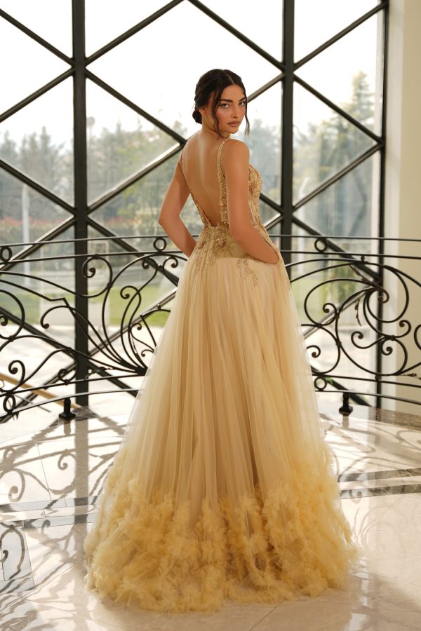 DESCRIPTIONThe Celeste is a harmonious blend of grand elegance and bold flair—perfect for the woman who wants to leave a lasting impression. From sparkling beadwork to dramatic tulle layers, it’s a regal vision come to life. With intricate beadwork and a luxurious layered tulle skirt, this gown weaves drama and elegance into one breathtaking look.